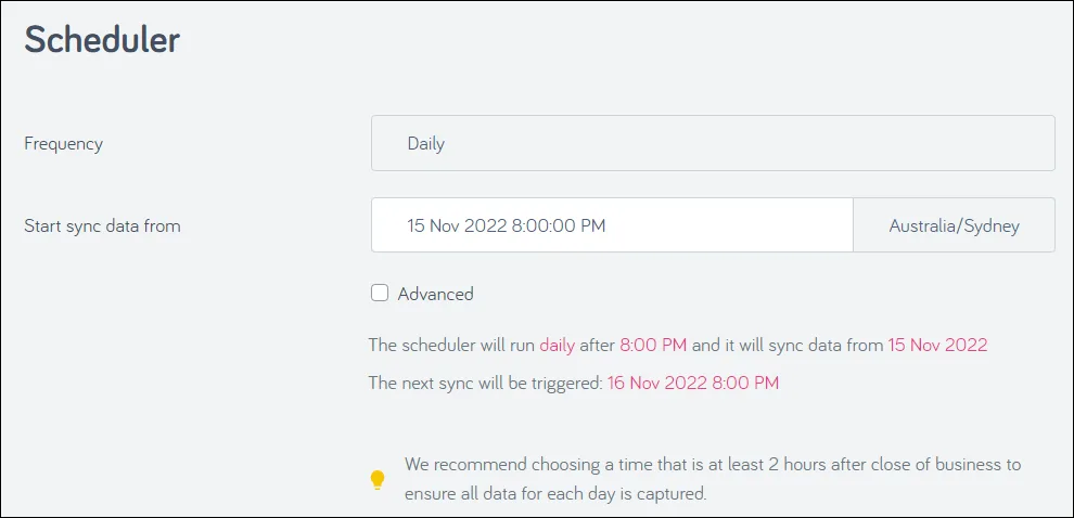 You can select the desired date you’d like to start your integration sync and also time you’d like it to run.