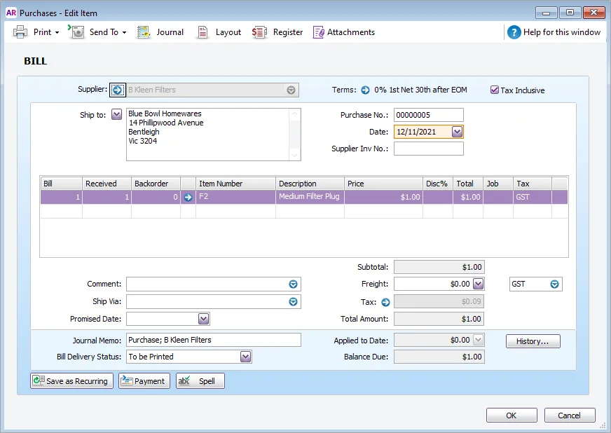 The supplier bill arrives with the confirmed cost. You convert the Receive Item purchase to a bill, but update the item price from $1 to $1.30: