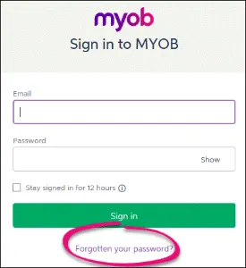If you have forgotten your MYOB account password, click Forgotten your password? and follow the prompts to reset it.