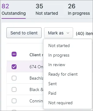 The Mark as options only changes the status in Tax. For example, if you choose Mark as > Sent, the tax notice won't be sent to the client. To send the tax notice, you need to select the Send to client button next to Mark as.