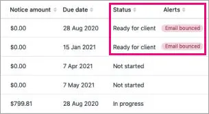 After you've sent a tax notice, keep an eye out for alerts about emails not being delivered. If emails can't be delivered, you'll see an Email bounced notification in the Alerts column in the Tax notices page. The tax notice status will also change from Sending back to Ready for client.