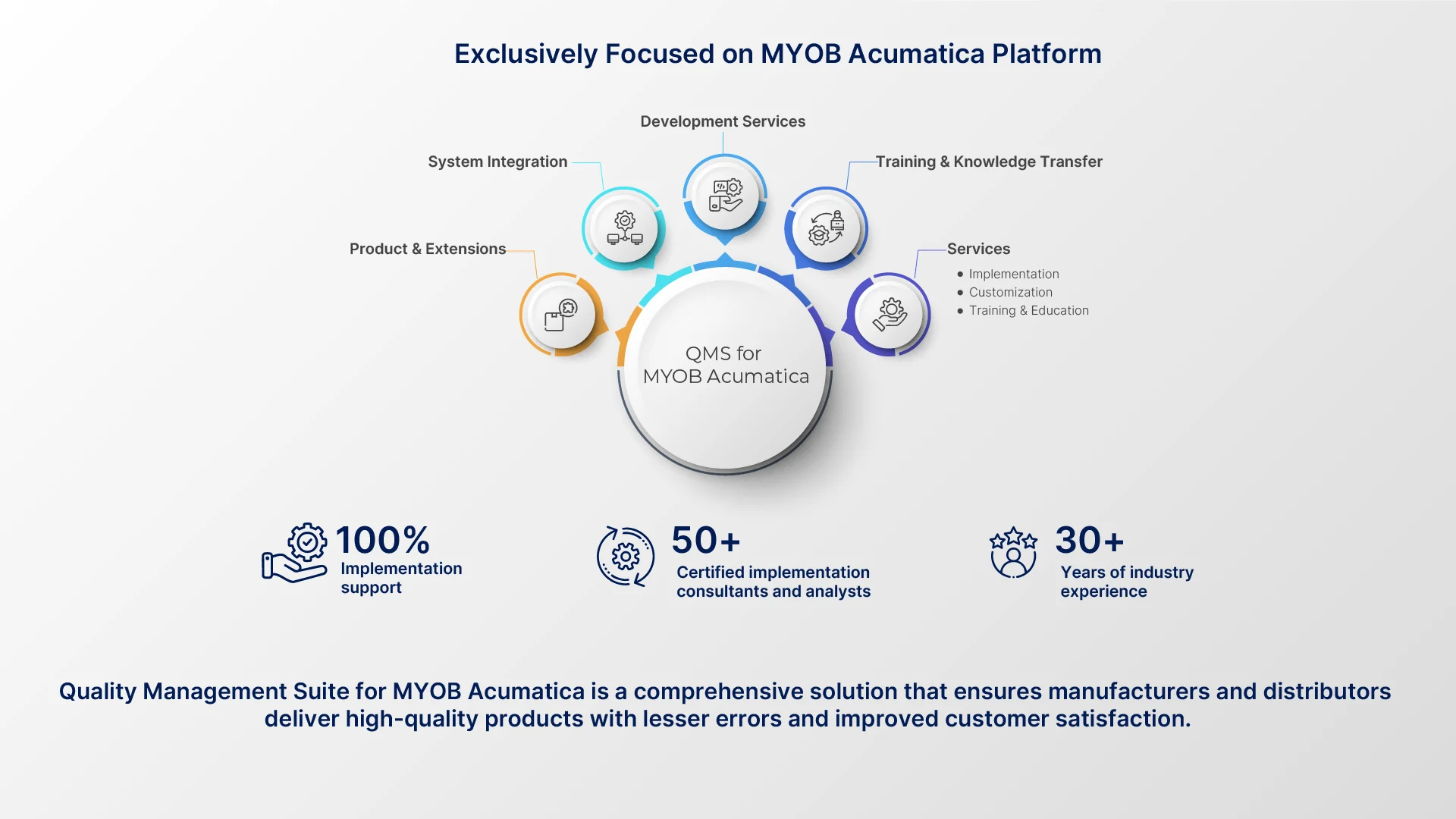 Built natively within the MYOB Acumatica framework, the Quality Management Suite seamlessly embeds quality control processes into your MYOB Acumatica workflows, eliminating the need for external systems or integrations.