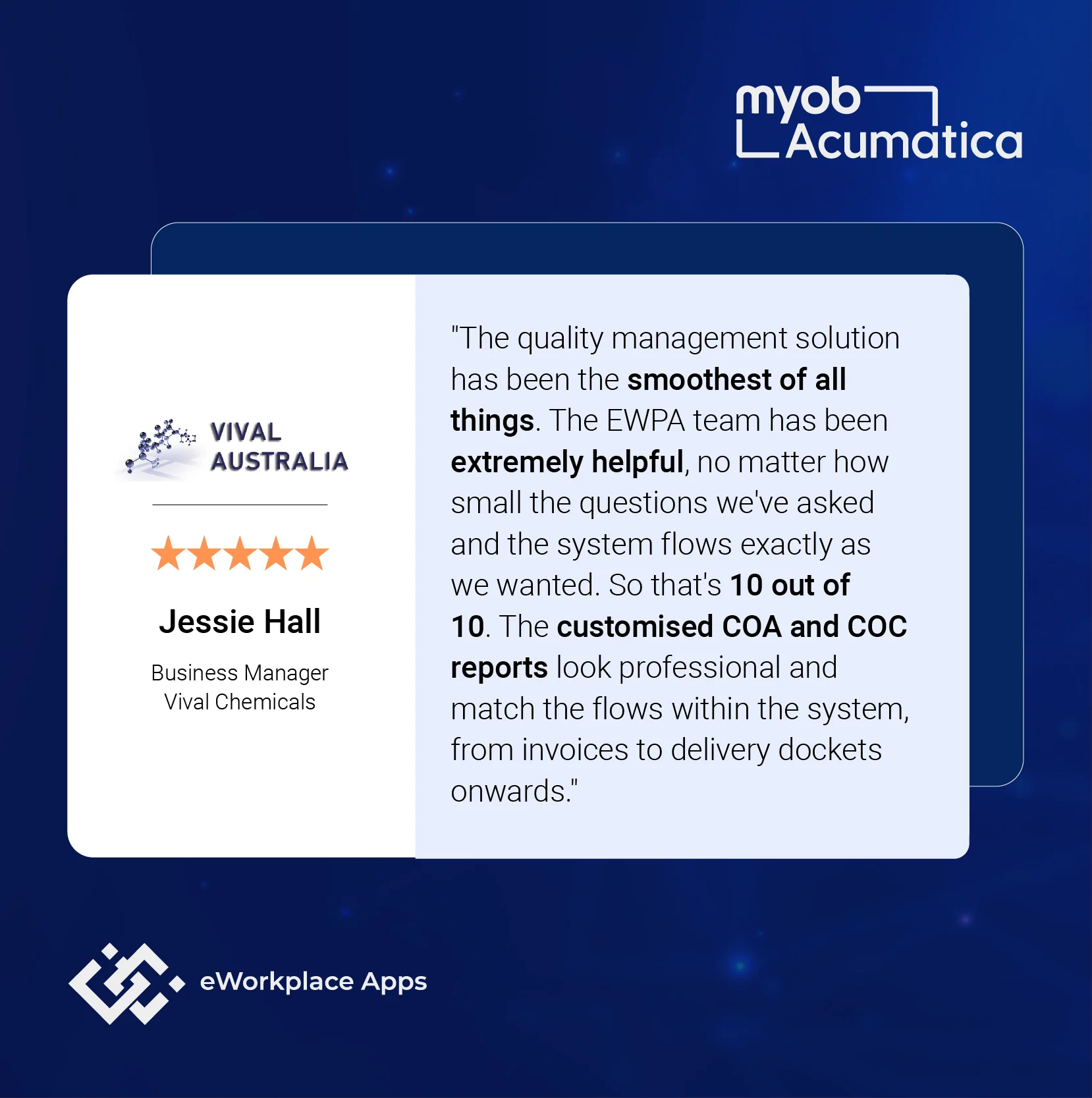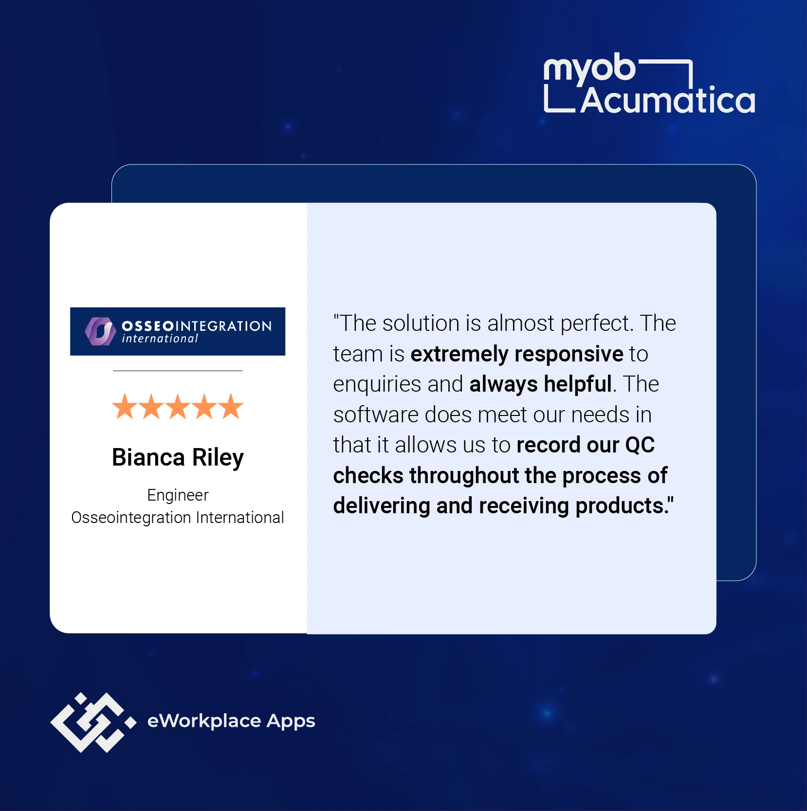 Meet your unique manufacturing and distribution quality needs with the Quality Management Suite (QMS) for MYOB Acumatica, powered by eWorkplace Apps. With over 30+ years of experience delivering solutions to process and discrete manufacturers, eWorkplace Apps brings deep industry expertise to help businesses achieve consistent product quality and compliance.
