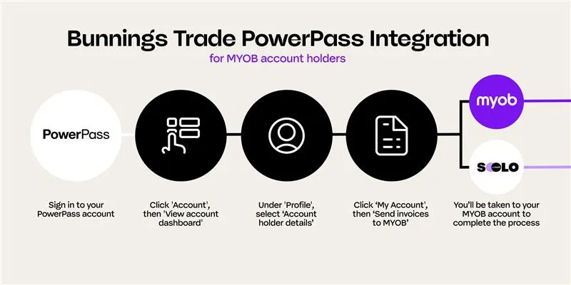 Solo by MYOB and MYOB Business integrate seamlessly with Bunnings Trade PowerPass so you can manage your entire business, all-in-one place.