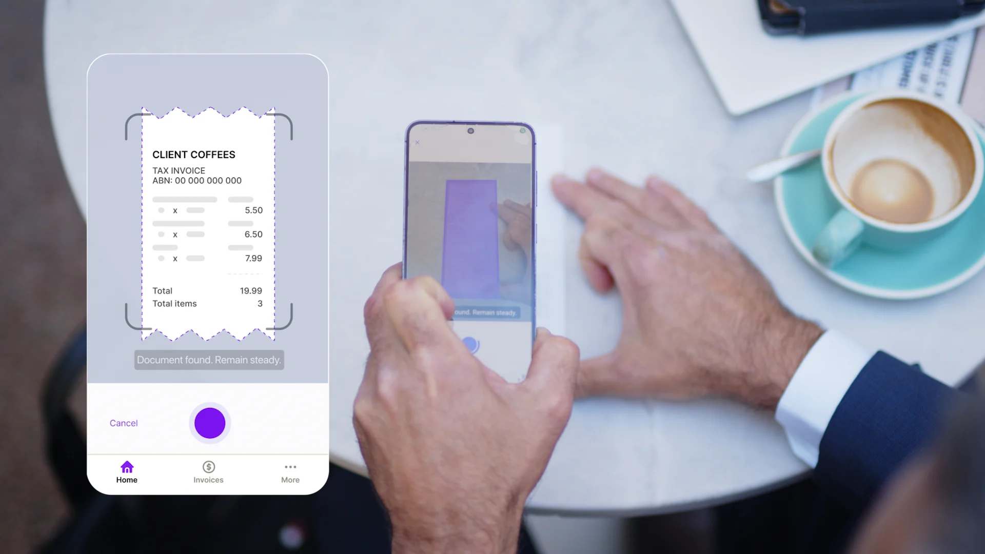 With MYOB Assist, whenever Brett pays for something, he snaps a photo of the receipt on the spot. The expense is captured instantly, he can add a note to help him categorise the expense, and that information syncs back to MYOB Business Lite.