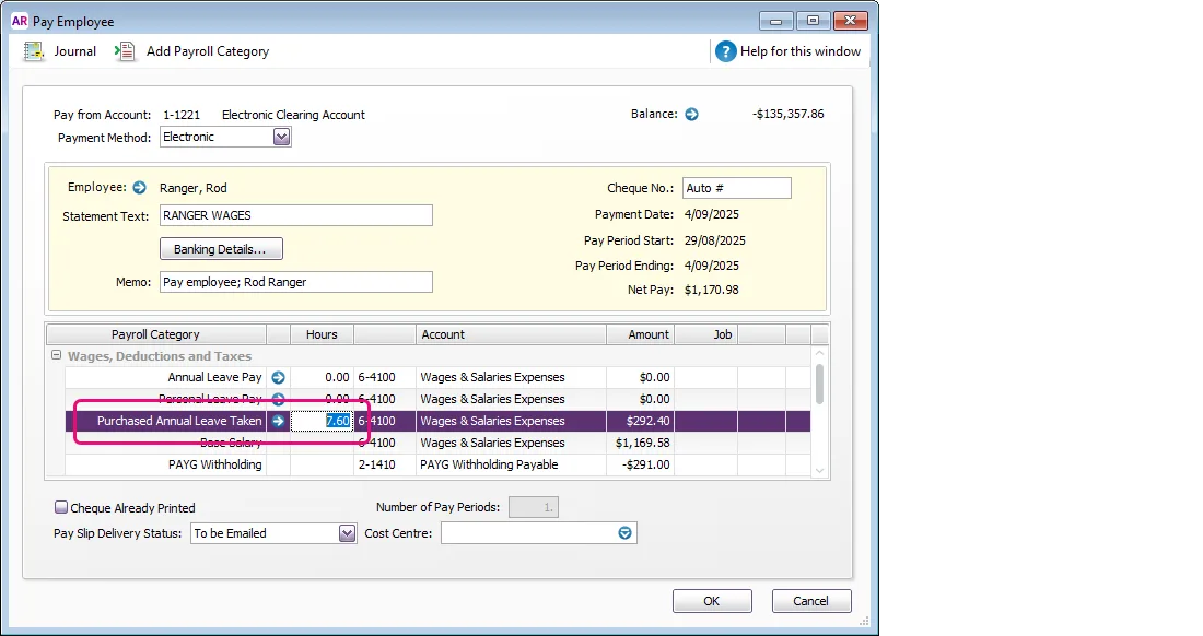 We recommend keeping purchased annual leave separate from an employee's regular annual leave in AccountRight. This makes it easier to: