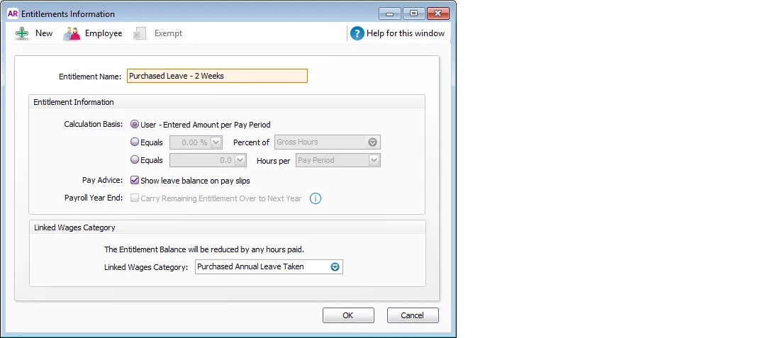 An entitlement category is needed to keep track of the purchased annual leave balance. If you have employees who purchase different quantities of annual leave, set up a separate entitlement category for each quantity. We'll set one up for the purchase of 2 weeks annual leave, but the same approach applies regardless of the quantity.