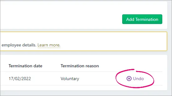 For the employee whose termination you need to remove, click the ellipsis (...) button and choose Remove termination.