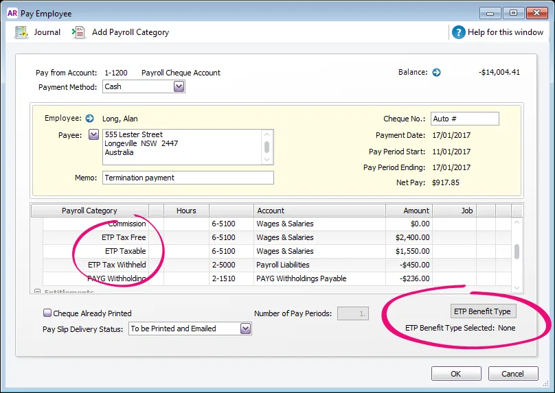 You can now record the terminated employee's ETP pay again, with the correct ETP amounts and details. If you need help workout out an ETP amount, or whether you need to pay super on the payment, check with your accounting advisor.