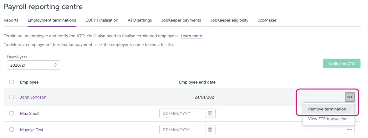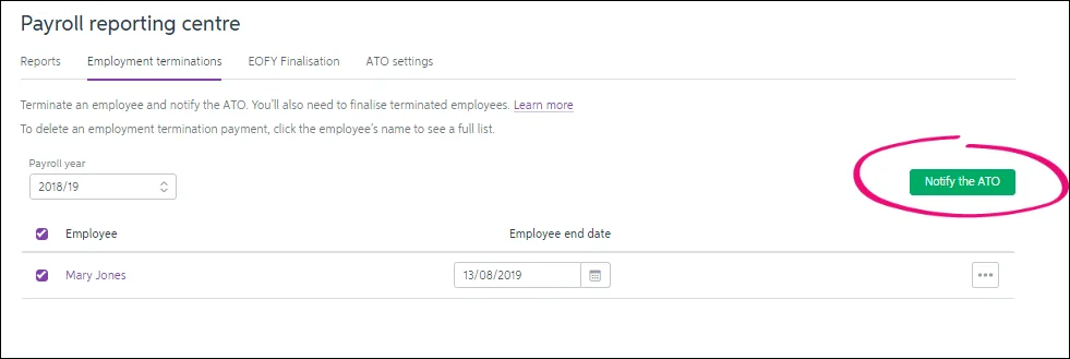 Select the employee who's leaving, choose their last day of employment, then click Notify the ATO.