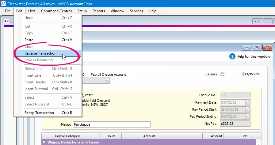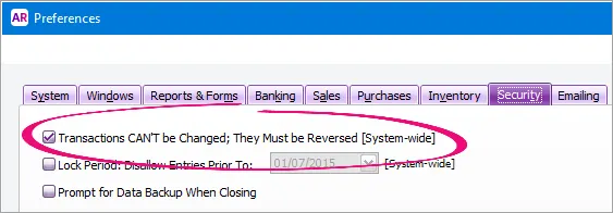 Set an AccountRight security preference to allow transactions to be reversed (go to the Setup menu > Preferences > Security tab > select the option Transactions CAN'T be Changed, They Must be Reversed > OK).