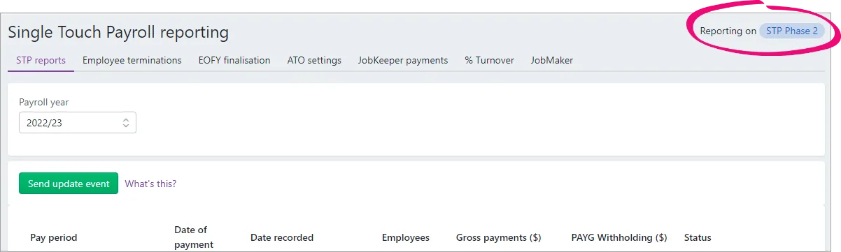 You can check in the STP reporting centre (Payroll command centre > Payroll reporting > Payroll Reporting Centre). If you don't see this label, you're on STP Phase 1. How do I get ready for STP Phase 2?