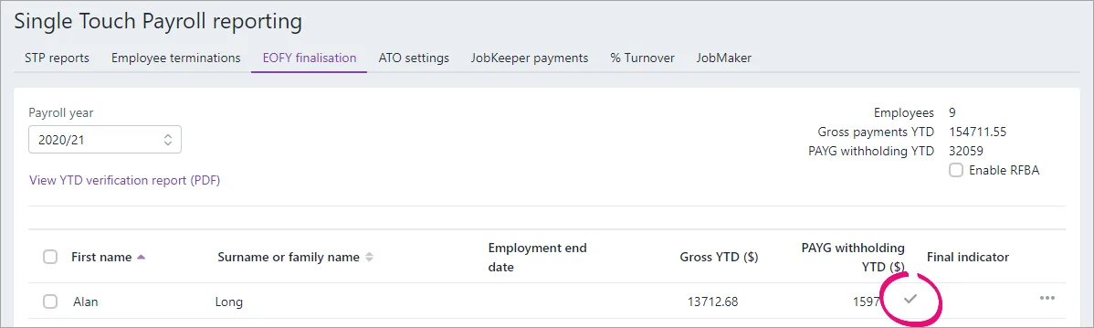 If the employee has been finalised, they will have the Final indicator ticked in the STP reporting centre.
